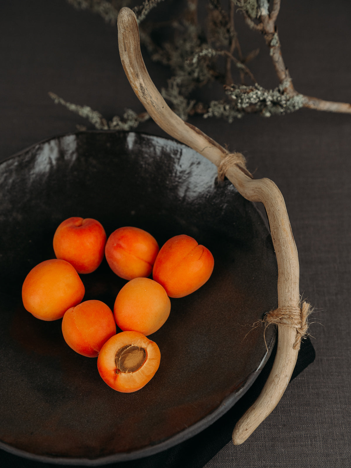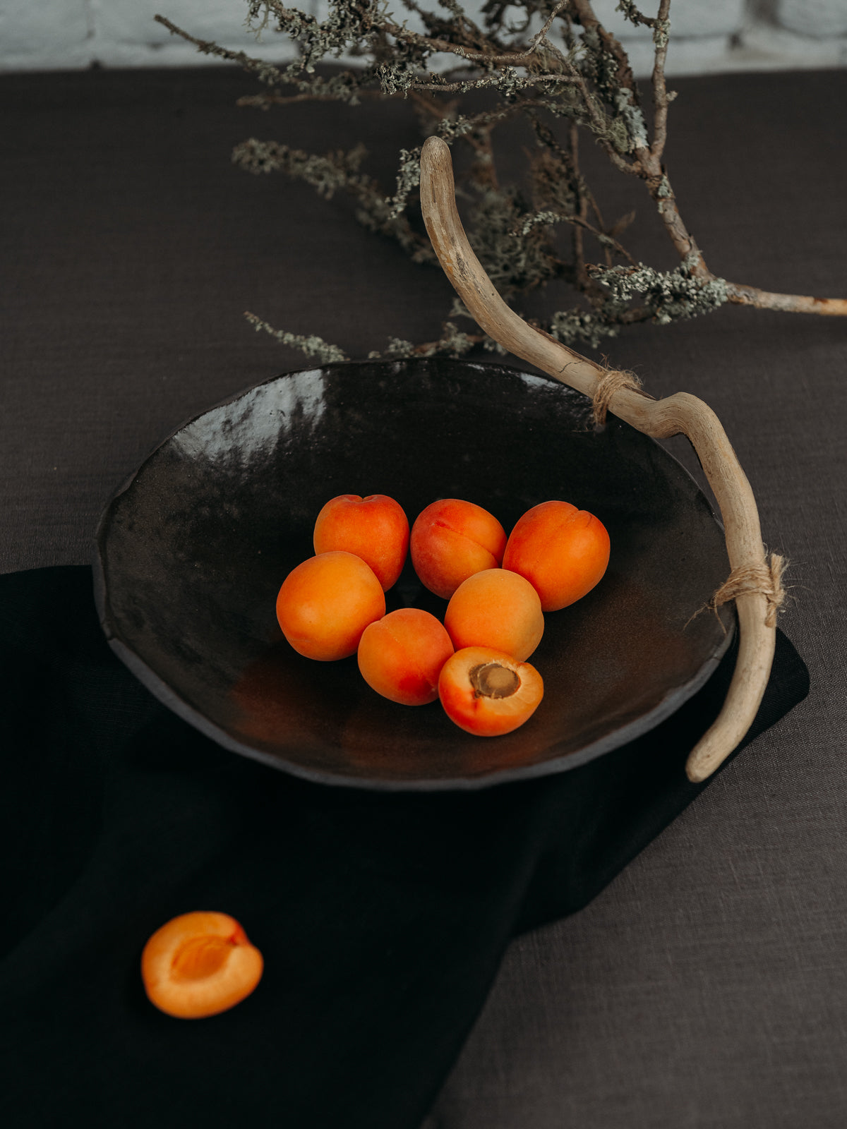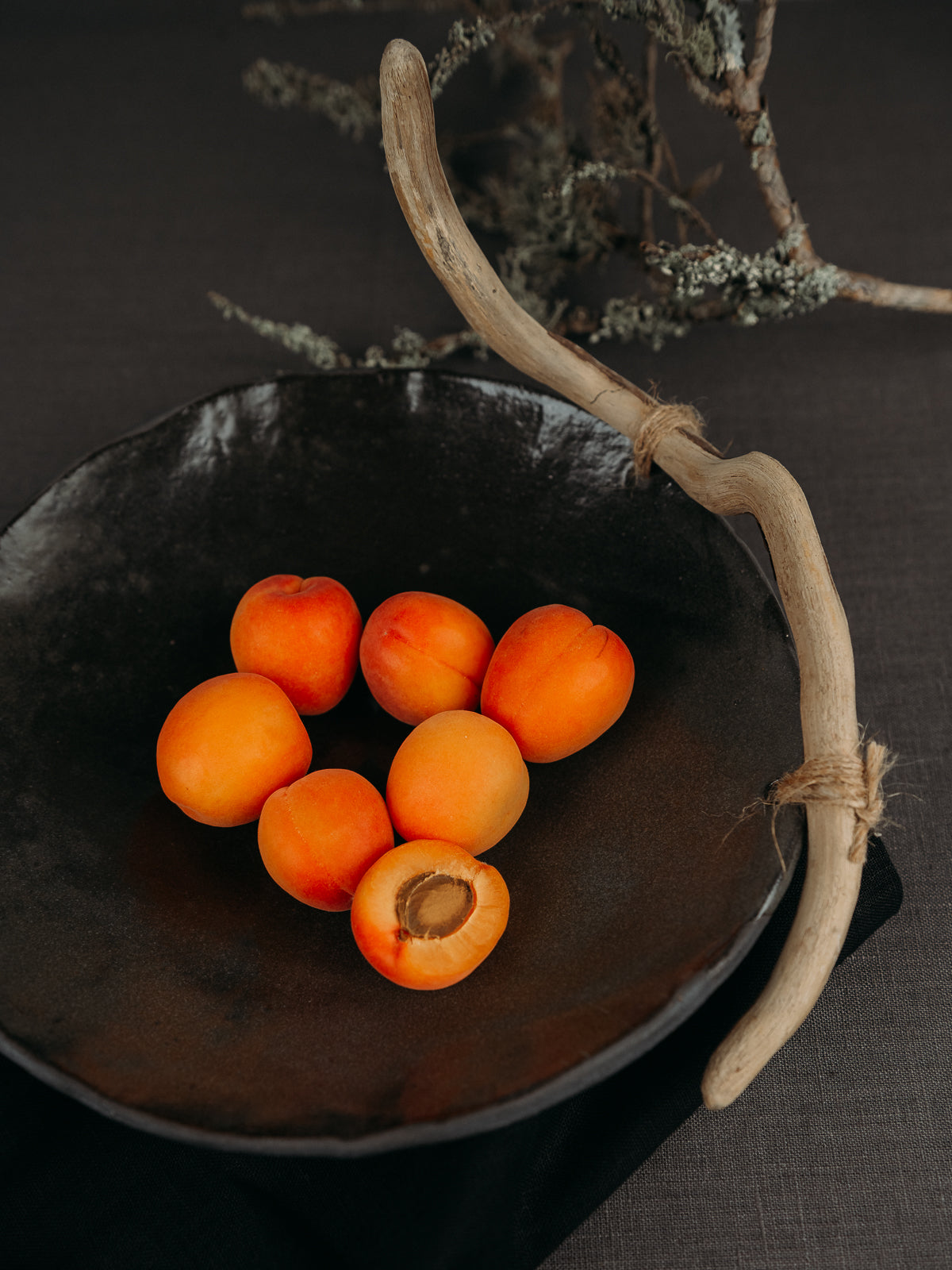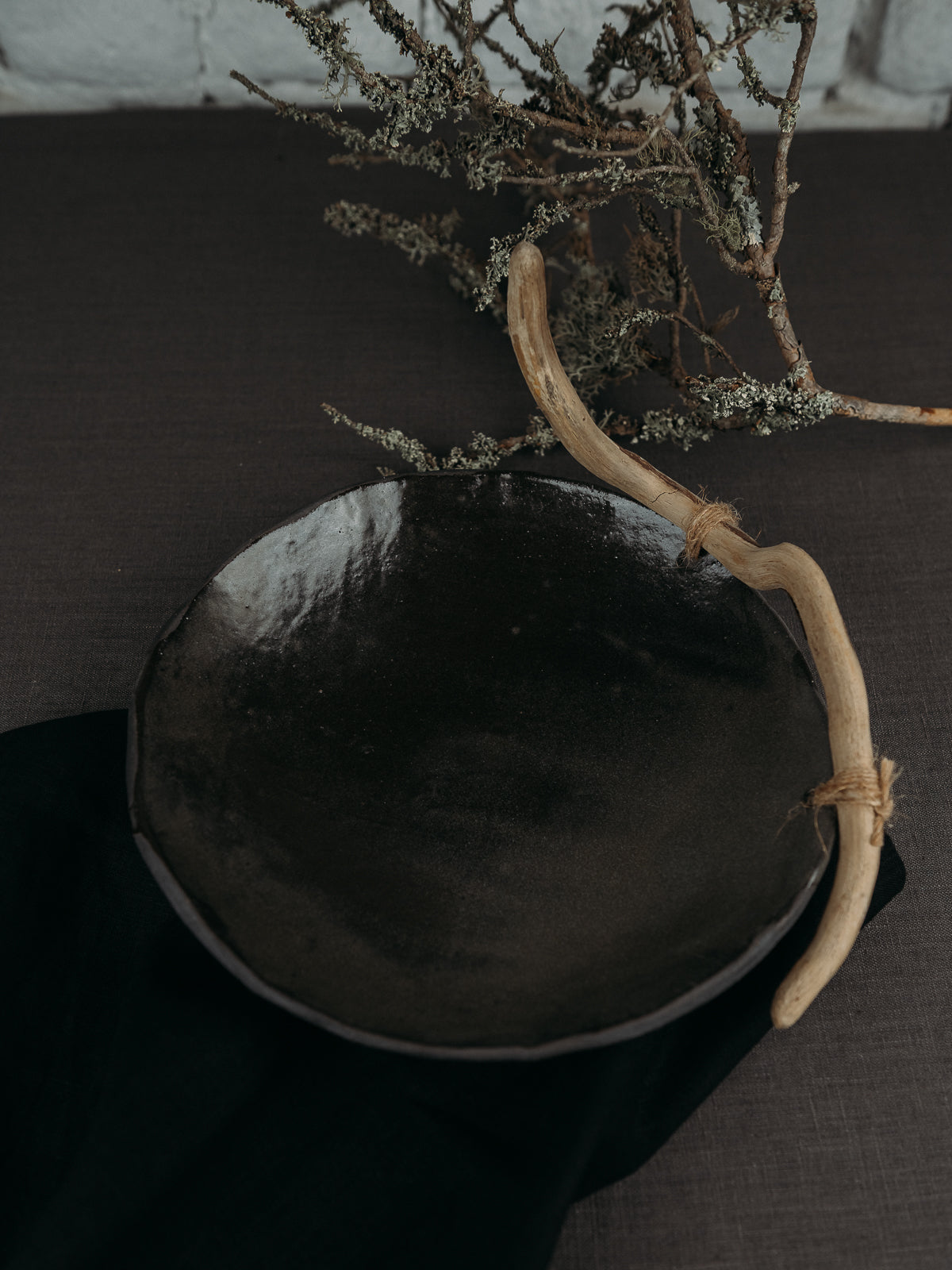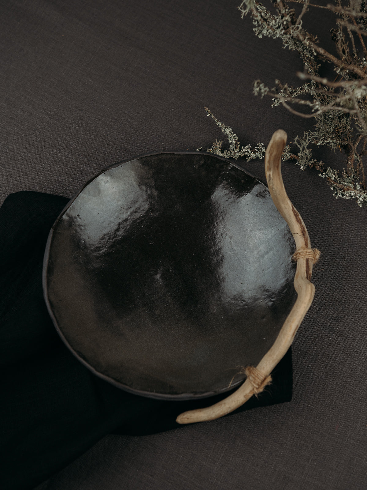 Roku darbs, kur satiekas jēgpilna vienkāršība un piejūras dabas spēks. Melnā akmensmasas bļoda veidota ar apzinātu lakonismu – kā mierpilns fons dekoratīvam akcentam: pie tās malas piesiets izskalots jūras koks. Tas ir jūras gludināts fragments ar savu formu, faktūru un stāstu, kas katrai bļodai piešķir neatkārtojamu raksturu.